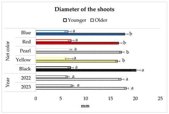 The diameter of the younger basal shoots in the bush did not differ significantly among the tested nets, while the diameter of the older shoots significantly increased under the black net (20.16 ± 0.83 mm). No significant difference was observed in the average diameter of older and younger shoots in the bush between the two examined years (Figure 5).