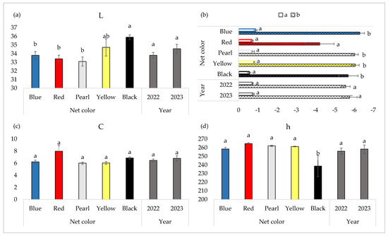 Blueberry fruit CIE L*a*b* color parameters for cv. ‘Duke’ grown under different photoselective nets over two seasons (2022–2023): L—lightness (a), a—greenness and b—blueness (b), C—chroma, (c) and h—hue angle (d). Data are the means (n = 3) ± standard error. The different letters within net color and year indicate statistically significant differences according to the LSD test at p ≤ 0.05.
