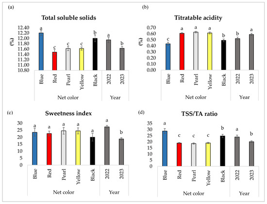 Blueberry fruit TSS (a), TA (b), SI (c), and TSS/TA ratio (d) for cv. ‘Duke’ grown under differentially colored photoselective nets over two seasons (2022–2023). Data are the means (n = 3) ± standard error. The different letters within net color and year denote significant differences according to the LSD test at p ≤ 0.05.