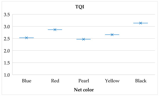 According to TQI, which comprised all previously determined fruit characteristics, the pearl and blue nets showed the best overall quality, while the black net scored the worst (Figure 9).