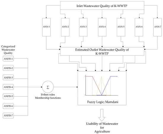 The primary objective of using a ANFIS in this study is to establish rules by categorizing each of the 7 different parameters fed from the K-WWTP effluent as inputs between 0 and 1, in accordance with FAO recommendations [23]. This method is applied according to the following steps:
