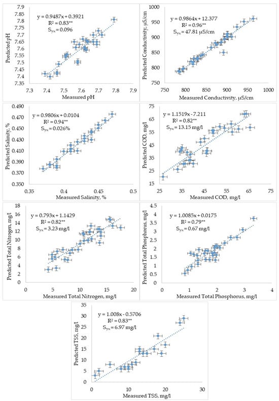 Verification was carried out with selected scenarios using separated ones. The graphs between predicted and observed values for all seven parameters are shown in Figure 2. The significance level of the R2 values obtained in the prediction models for the selected scenarios is p < 0.01 and 0.05, which is significant, indicating that the models produce predictions close to the measured values.