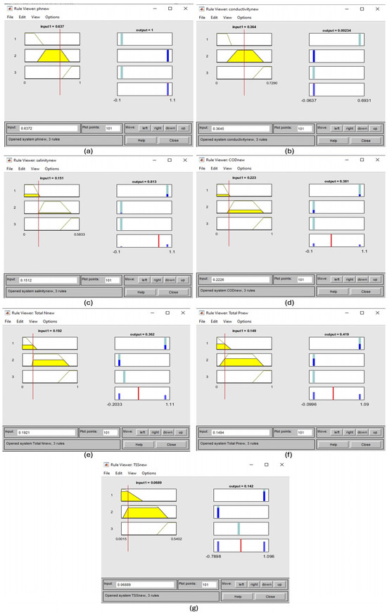 ANFIS rules with output membership function sets generated by the model (a–g) refer to pH, EC, salinity, COD, total N, total P, and TSS, respectively.