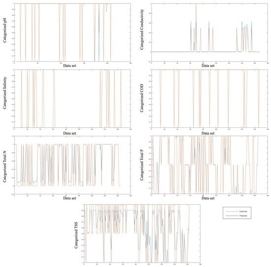 A total of 70 scenarios were tested, with 10 scenarios for each output parameter, using a different number of hidden neurons, training functions, Epoch numbers, and training/validation/testing ratios. For each output parameter, the first scenario and the model that provided the highest R2 and the lowest MSE are summarized in Table 3. It was found that the best performance of training of models is 80% for the dataset of pH, Conductivity, COD, and total P, 85% for the dataset of total N and Salinity, and 75% for the dataset of TSS. It used 5–10% of the dataset in validation in order to avoid switching to over-learning in those parameters. The remaining part of the dataset was used for the testing of models. As trained networks, Levenberg–Marquardt and Bayesian Regularization algorithms were tried out for each parameter and scenario. As a result, the highest correlation, minimum mean square error, and minimum number of input parameters were taken into account to choose the best model. The biggest advantage of this study is that different output data can be estimated with the same input dataset. In other words, while the same input dataset can be used for salinity and conductivity, their order can be changed according to the importance level. All scenarios and model parameters were examined, and the best one was chosen.
