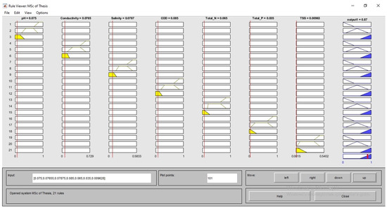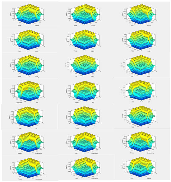 In the model, the wastewater quality perspective varied between 69% and 72% during the irrigation season, depending on treated wastewater quality parameters of K-WWTP. It was determined that 87% of the water was usable when K-WWTP carried out the treatment process with optimal efficiency for each parameter (Figure 5). On the other hand, when K-WWTP had the worst performance, this usability rate was found to be 13%, as shown in Figure 6. The evaluation of all parameters in a single fuzzy system and the relationship of all parameters to each other is shown in Figure 7.
