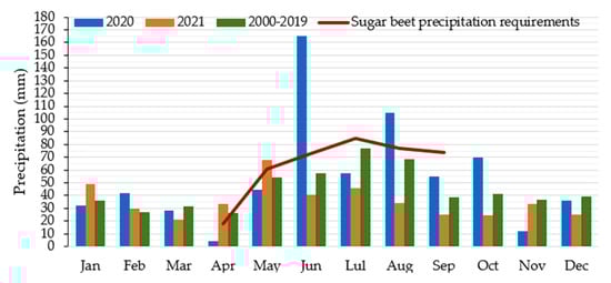 Average monthly precipitation in 2020 and 2021 compared to multi-year averages (2000–2019) of precipitation and sugar beet precipitation requirements [].