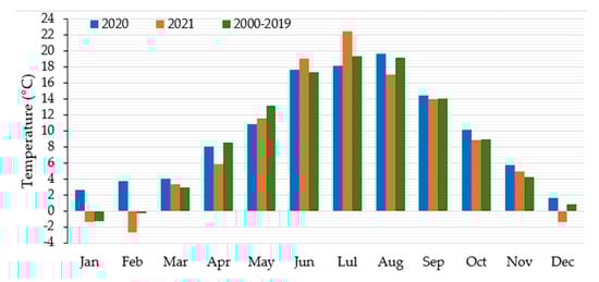 Average monthly temperatures in 2020 and 2021 compared to 2000–2019 averages.