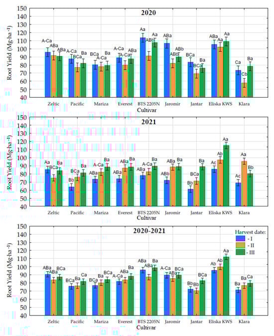 Sugar beet root yield depending on cultivar and harvest date in 2020 and 2021, along with average values for 2020–2021. The same capital letters within a given harvest date indicate no significant differences among cultivars; the same lowercase letters within a given cultivar indicate no significant differences among harvest dates. Harvest dates: 8–10 September—first date; 7–8 October—second date; and 3–5 November—third date.