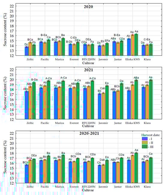 Across the two-year study period, Eliska KWS consistently demonstrated the highest average sucrose content, which was comparable to that of Pacific, Mariza, Everest, BTS2205N, Jantar, and Klara at the first harvest date. Delaying the harvest from September to October resulted in a significant increase in sucrose content for Zeltic and Eliska KWS, whereas postponing it from October to November led to a significant increase in sucrose content in Pacific, Mariza, Everest, BTS2205N, Jaromir, Jantar, Eliska KWS, and Klara.