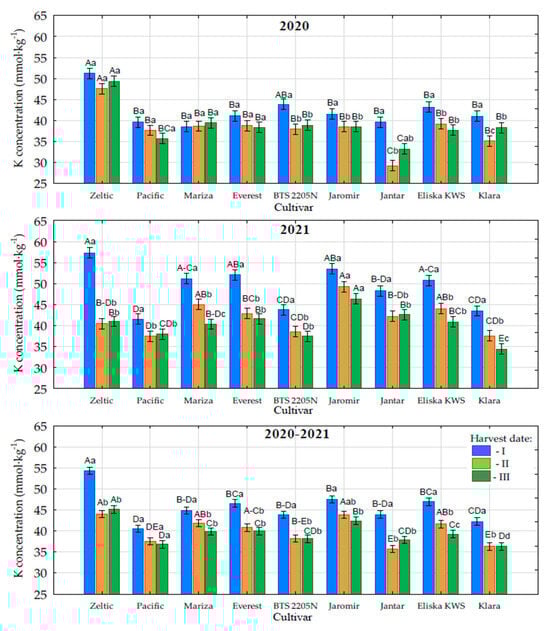 Potassium content in sugar beet roots depending on cultivar and harvest date in 2020 and 2021, along with average values for 2020–2021. The same capital letters within a given harvest date indicate no significant differences among cultivars; the same lowercase letters within a given cultivar indicate no significant differences among harvest dates. Harvest dates: 8–10 September—first date; 7–8 October—second date; and 3–5 November—third date.