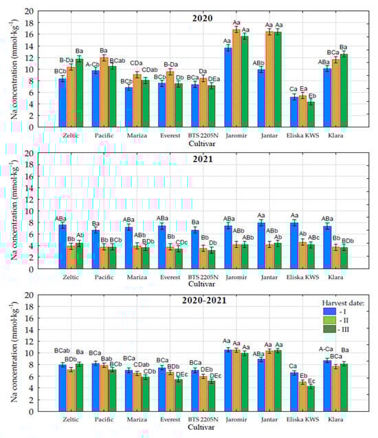 Across the two-year study period, Eliska KWS had the lowest average Na content, which was comparable to that of Zeltic, Pacific, Mariza, Everest, BTS2205N, and Klara at the first harvest date. Delaying the harvest from September to October significantly reduced Na levels in Everest, BTS2205N, and Eliska KWS, while postponing the harvest from October to November further decreased Na content in the same three cultivars. At the second and third harvest dates, Eliska KWS again had the lowest Na content, followed by Zeltic, Pacific, Mariza, and Klara, while Jaromir and Jantar had the highest value.