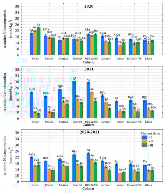 Content of α-amino nitrogen in sugar beet roots depending on cultivar and harvest date in 2020 and 2021, along with average values for 2020–2021. The same capital letters within a given harvest date indicate no significant differences among cultivars; the same lowercase letters within a given cultivar indicate no significant differences among harvest dates. Harvest dates: 8–10 September—first date; 7–8 October—second date; and 3–5 November—third date.