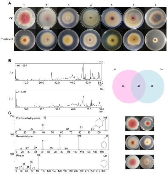 Volatile substances produced by B. subtilis A3. (A) Antibacterial spectrum (1: Fusarium graminearum, 2: F. oxysporum, 3: F. solani, 4: F. verticillioides, 5: Curvularia lunata, 6: Helminthosporium carbonum, 7: F. acuminatum). (B) GC-MS results for A3 and B. vallismortis 3-1 (left panel) and their common and unique volatile substances (right panel). (C) Structures of three volatile substances (left panel) and their inhibitory effect on F. graminearum (right panel).