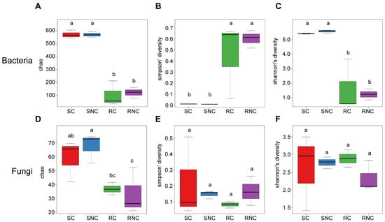 Alpha diversity (Chao 1, Shannon, and Simpson) of the 16S rRNA gene-based bacterial communities and ITS gene-based fungal communities. (A–C) Bacterial community. (D–F) Fungal community. Group SC represents rhizosphere soil treated with A3. Group SNC represents rhizosphere soil treated without A3. Group RC represents root endophyte treated with A3. Group RNC represents root endophytic treated without A3. One-way ANOVA and multiple pairwise comparison (Duncan) were used with p < 0.05, n = 3. Lower case letters at each group (“a” and “b”) indicate differences among the four treatments, and the same letters mean that they are not significantly different at p < 0.05.