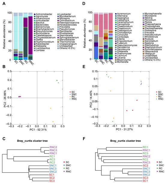 Differences in bacterial (left panel) and fungal (right panel) community structures of different samples. (A,D) Relative abundances of bacterial (A) and fungal (D) genera in different samples. (B,E) PCoA of bacterial (B) and fungal (E) communities. (C,F) Cluster tree of soil bacterial (C) and fungal (F) communities from different rhizosphere soil samples based on the Bray–Curtis index. Group SC represents rhizosphere soil treated with A3. Group SNC represents rhizosphere soil treated without A3. Group RC represents root endophytic treated with A3. Group RNC represents root endophytic treated without A3.
