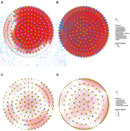 Co-occurrence network analysis of bacterial and fungal communities. (A,B) Co-occurrence network of the bacterial communities of the A3 (A) and control (B) treatments. (C,D) Co-occurrence network of the fungal communities of the A3 (C) and control (D) treatments.