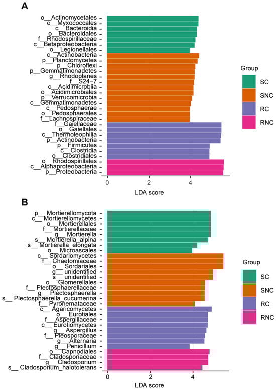 Linear discriminant analysis effect size (LEfSe) for different groups. (A) Bacteria. (B) Fungi. Group SC represents rhizosphere soil treated with A3. Group SNC represents rhizosphere soil treated without A3. Group RC represents root endophytic treated with A3. Group RNC represents root endophytic treated without A3.