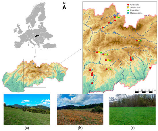 Map of localities in Central Slovakia and photos from selected study sites; (a) Grassland on slope; (b) Arable land, grassland, and forest land on slope; (c) Grassland and riparian zone on plain.