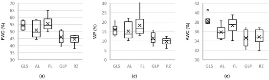 The FWC, WP, and AWP indicators showed the same trends among ecosystems. We found the highest mean FWC for FL soils (55.5%), followed by GLS soils (54.3%). However, the highest and therefore most favorable SWDI index was calculated for GLP soils.