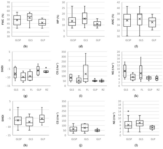 Hydrological indicators and carbon and nitrogen stocks under different land uses; (a,b) Field water capacity, (c,d) Wilting point, (e,f), Available water capacity, (g,h) Soil water deficit index, (i,j) Carbon stock, (k,l) Nitrogen stock. Figures (a,c,e,g,i,k) show indicators within 6 slope and 6 plain study sites with localities of different land uses (GLS, AL, FL at slope study sites; GLP, RZ at plain study sites). Figures (b,d,f,h,j,l) show indicators of all GL localities (GLSP), and separately for slope (GLS) and plain (GLP) localities. Abbreviations: GLSP—Grasslands on slope and plain, GLS—Grassland on slope, GLP—Grassland on plain, AL—Arable land on slope, FL—Forest land on slope, RZ—Riparian zone on plain.