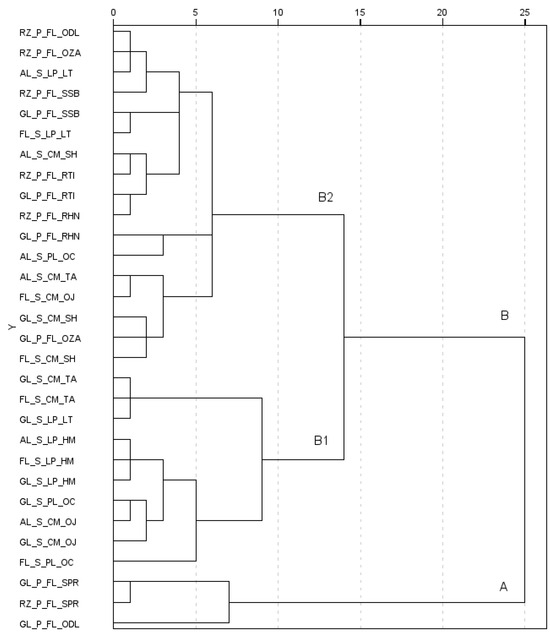 The HCA (Figure 3) has highlighted two large clusters (A and B). Cluster A contains three sites on Fluvisol that are situated on plains and used as GL and RZ. Two clusters of lower hierarchical order are recognized in B (B1 and B2). Cluster B1 exclusively includes sites situated on slopes used as GL, FL, and AL. Cluster B2 includes nine sites situated on plains and eight situated on slopes with all land use types.