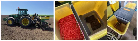 Seeding equipment was a uniquely built seeder based on “Busa” chassis and a Precision Planting (Precision Planting LLC., Tremont, IL, USA) seeding unit supplied with a 20/20 monitor system. The seed tank was divided into two parts, each controlled by an mSet unit, which managed the separation and transition between different hybrids. This system regulated the opening and closing mechanisms to ensure seamless hybrid switching. Unlike conventional planters, which do not support on-the-go hybrid transitions, the mSet system enables the planting of two hybrids within a single field using a divided hopper and a Precision Planting vSet meter. Additionally, the mSet unit is integrated with SpeedTube technology, allowing for efficient high-speed multi-hybrid planting while maintaining precision (