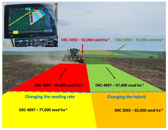 Variable rate seeding is a well-known practice in precision agriculture. Moreover, choosing the appropriate hybrid for maize production is crucial for successful farming practices. Soil variability occurs within-field in most agricultural lands in Hungary; therefore, within-field hybrid switching is a new perspective for precision agriculture. Changing the seed rate within a field highly depends on the hybrid and the effect of the climatic conditions of the growing season; therefore, generalized, exact figures can be misleading. As it can be found in the literature, an average of 67,000–87,000 seeds ha