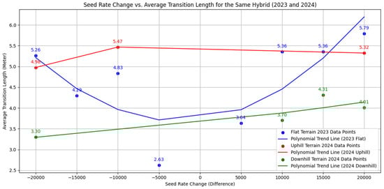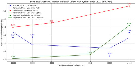 Table 3. The key findings indicate that the measured data differ across years. Moreover, when hybrid switching occurs, the transition distances are longer compared to cases where only the variable seeding rate is applied within the same hybrid.