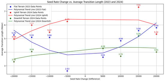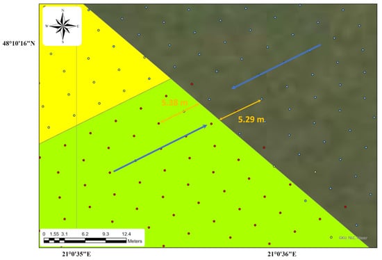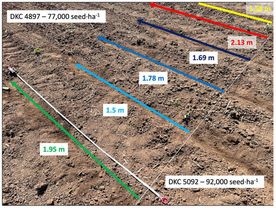 In 2023, for the hybrid DKC 5092, when changing the seeding rate from 72,000 to 82,000 seed ha−1, the distance was 5.36 m and from 72,000 to 92,000 seed ha−1, the distance was 5.98 m. This means the higher the difference between the seed rates, the higher the distance from the theoretical changing line. The same applies when calculating the differences for the seed rate from 77,000 to 82,000 and 92,000 seed ha−1. The 77,000 seeds ha−1 occurred only in the edge of the experimental field, which was circum-seeded by the same (DKC 5092) hybrid. When the seed rate is changed for a lower rate, the distances are shorter from the theoretical changing line. In the case that the seed rates are changing only by 5000 seed ha−1, the distance for changing was only 2.63 m, which is within the accuracy expectations.