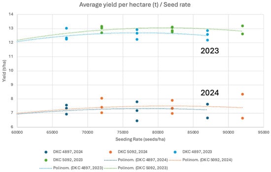 Section 2. (Materials and Methods). The purpose of the figure is to show how each seeding density affected the yield, thus providing an opportunity for optimization. The results confirm that the appropriate adjustment of the seeding rate has a significant effect on yield and profitability. It is important to emphasize that maximum yield does not mean maximum profitability and that hybrid selection and correct spacing also have an impact on profitability and yield levels.