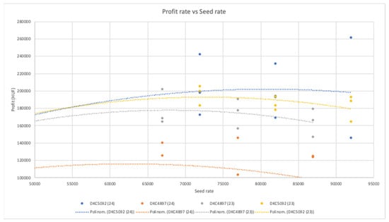 The effect of variable rate seeding on the profit was calculated for both of the hybrids and the variable rate seeding. It is clearly visible that while the highest yield in 2023 was achievable around 12.5 t ha