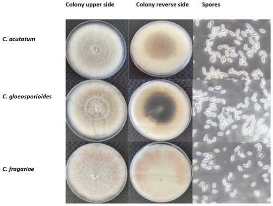 The morphological characteristics of C. acutatum, C. gloeosporioides, and C. fragariae are presented in Figure 1. The colonies’ appearance (colour, structure, and growth) on the Petri dish with the PDA medium was marginally different when comparing the upper and reverse images of the colonies (at least after 14 DPI), but it is challenging to identify the species visually. C. acutatum colonies had the lowest diameter (33.15 ± 1.44 mm), whereas C. fragariae isolation colonies grew the fastest and had the largest diameter (41.27 ± 1.14 mm). Compared to other species, the colony growth of C. gloeosporioides isolates was average (37.63 ± 1.76 mm). In addition, the C. fragariae isolates were light grey; C. acutatum isolates ranged in colour from white to grey and C. gloeosporioides isolates were dark grey.