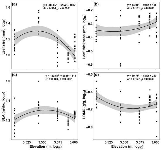 We fitted linear or nonlinear models to study the relationships of leaf traits (leaf size, leaf thickness, SLA, or LDMC) or biomass accumulation (aboveground biomass, underground biomass, and total biomass) and allocation with elevation changes using the ggtrendline function in the R package ggtrendline [37].