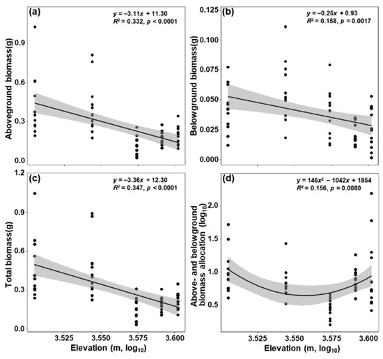 Relationships of elevation with aboveground biomass (a), belowground biomass (b), total biomass (c), and above- and belowground biomass allocation (d).