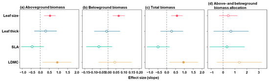 Effect sizes of four leaf traits on aboveground biomass (a), belowground biomass (b), total biomass (c), and above- and belowground biomass allocation (d). Effect sizes are slopes of the relationships of four leaf traits with biomass accumulation and allocation in the linear mixed-effect models. Points and error bars represent the estimated effect sizes and their 95% CIs. Effect sizes are determined as significant if the 95% CI do not include zero (i.e., p < 0.05), and significant ones are indicated by solid dots and error bars. And non-significant ones are indicated by empty dots and error bars.