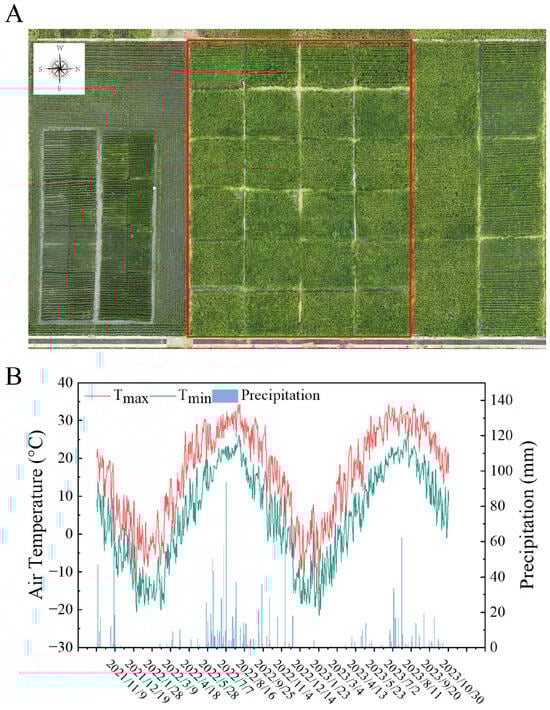 Experimental field layout panorama (A). Daily precipitation, maximum and minimum air temperature from 2021 to 2023 (B). Tmax and Tmin represent the maximum and minimum air temperature, respectively.