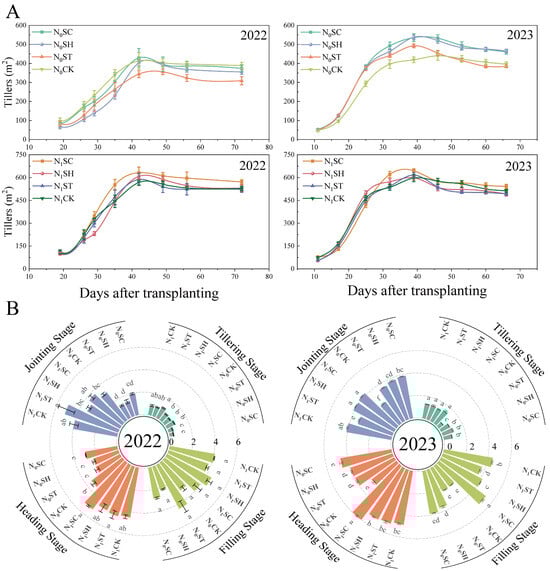 Changes in rice tillering dynamics and leaf area index under different treatments. (A) shows the rice tillering dynamics under different treatments in 2022 and 2023, while (B) shows the changes in leaf area index under different treatments. Data are presented as mean ± SE. Different treatments with the same lowercase letter in the same period indicate no significant difference in Tukey’s test for multiple comparisons, while different letters indicate a significant difference (p < 0.05). SC: straw incorporation with shallow rotary tillage in autumn; SH: straw incorporation with plowing in autumn; ST: straw spread on the soil surface in autumn and plowed into the soil in spring; CK: no straw incorporation. The same designations are used below.