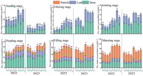 Dry matter accumulation and distribution in rice under different treatments. Data are presented as mean ± SE. Different treatments with the same lowercase letter in the same period indicate no significant difference in Tukey’s test for multiple comparisons, while different letters indicate a significant difference (p < 0.05).