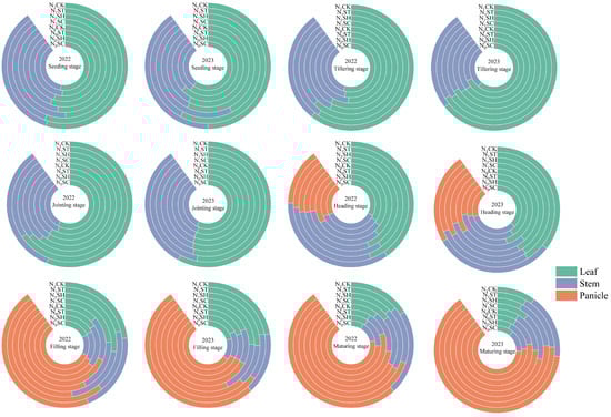 Changes in nitrogen distribution in different rice organs under various treatments.