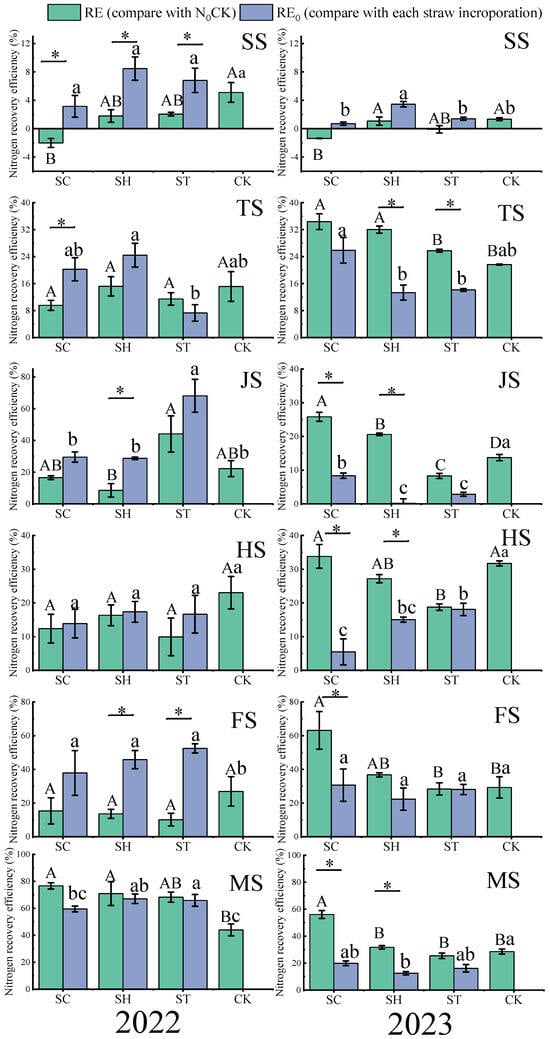 Nitrogen recovery efficiency of rice at different stages under various treatments from 2022 to 2023. Data are presented as mean ± SE. Different treatments with the same lowercase letter in the same period indicate no significant difference in Tukey’s test for multiple comparisons, while different letters indicate a significant difference (p < 0.05). Among the treatments with the same straw incorporation regime, those without nitrogen served as the reference baseline. Different treatments with the same capital letter in the same period indicate no significant difference in Tukey’s test for multiple comparisons, while different letters indicate a significant difference (p < 0.05). Among the treatments without straw incorporation, those without nitrogen served as the reference baseline. * indicates a significant difference in the nitrogen recovery efficiency calculated based on the two baselines. The significance of the difference was analyzed using a t-test, and a significance level of 0.05 was adopted.