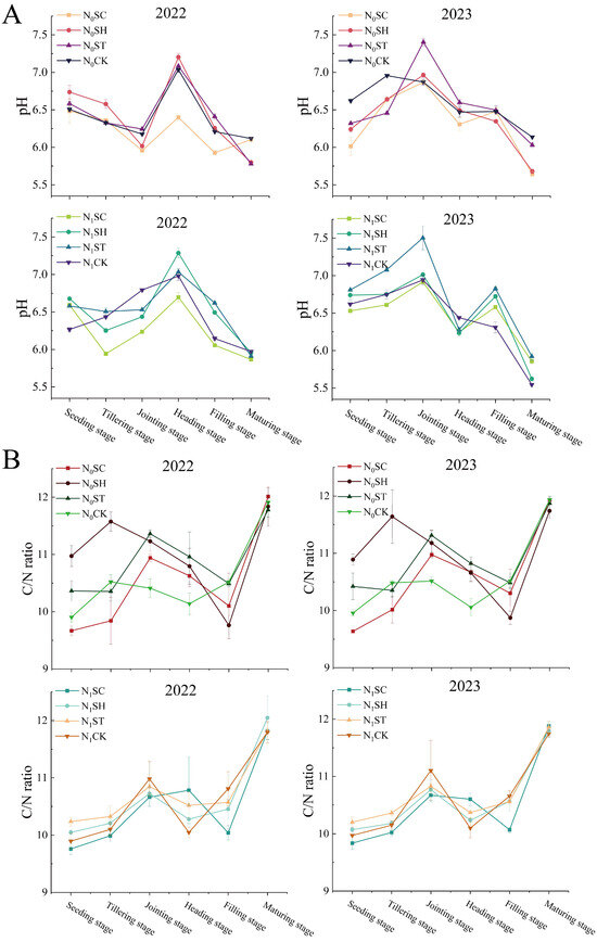 The changes in soil pH under different straw incorporation regimes are presented in Figure 6A. Among the N0 treatments, the soil pH decreased significantly and then increased before decreasing in 2022. In 2023, the soil pH initially increased and then decreased, exhibiting a dependency on the different straw incorporation regimes. Compared to CK, the pH in N1 treatments with straw incorporation first decreased and then increased. Thus, the straw incorporation regime significantly impacted pH stability (Figure S1) and exhibited a significant interaction effect with the nitrogen fertilizer application. Figure 6B illustrates the changes in the soil carbon-nitrogen ratio. During the rice growth period, the carbon-nitrogen ratio first increased, and then decreased before increasing again. The minimum ratio was observed during the early stages (seedling and tillering stages) in the SC treatments, while the maximum ratio was observed during the harvest stage in the SC treatments. Further stability analysis (Figure S2) found that the SC treatments reduced the stability of the soil carbon-nitrogen ratio during the rice growth period, whereas the SH and ST treatments increased the stability of the soil carbon-nitrogen ratio compared to CK.