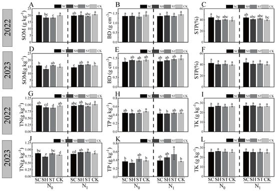 Changes in the physical structure and total nutrients of paddy soil under different treatments. (A,D) soil organic matter content (SOM), (B,E) soil bulk density (BD), (C,F) soil total porosity (STP), (G,J) soil total nitrogen content (TN), (H,K) soil total phosphorus content (TP), (I,L) soil total potassium content (TK). Data are presented as mean ± SE. Different treatments with the same lowercase letter in the same period indicate no significant difference in Tukey’s test for multiple comparisons, while different letters indicate a significant difference (p < 0.05).