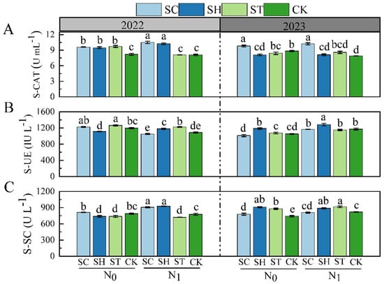 Soil enzyme activity represents the biological activity and intensity of biological reactions in the soil. As shown in Figure 8A, straw incorporation treatments significantly enhanced soil catalase (S-CAT) activity, especially the SC treatments. Figure 8B shows the soil urease (S-UE) activity, where the straw incorporation regime exhibits a significant interaction effect with nitrogen fertilizer (Table S4). Nitrogen fertilizer application inhibited S-UE activity in 2022 but promoted S-UE activity in 2023. Meanwhile, the straw incorporation treatments significantly increased S-UE activity compared to CK. The soil sucrase (S-SC) activity under the different treatments is presented in Figure 8C. Straw incorporation increased S-SC activity, and nitrogen fertilizer application exhibited a synergistic effect with straw incorporation, especially in the SH treatments.