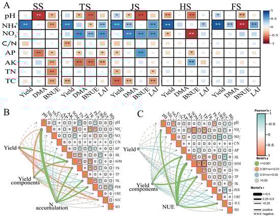 Analysis of rice yield correlated with soil environmental factors and rice growth indices based on the Mantel test (A). The correlations of soil environmental factors at different rice growth stages with yield or dry matter accumulation, nitrogen recovery efficiency, and leaf area index at each stage were based on Spearman analysis. SS denotes the seeding stage, TS the tillering stage, JS the jointing stage, HS the heading stage, and FS the filling stage. DMA, dry matter accumulation; BNUE, biomass nitrogen use efficiency; LAI, leaf area index. (B,C). The correlations of soil physicochemical factors at the mature stage with rice yield in the N0 and N1 treatments and the correlations between soil environmental factors and yield, yield components, and nitrogen recovery efficiency were based on the Mantel test. * and ** indicate significance at the 0.05 and 0.01 levels, respectively.