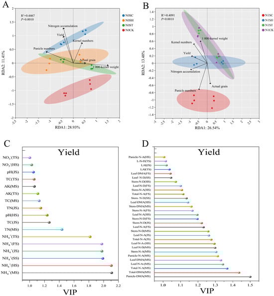 Redundancy analysis and partial least squares discriminant analysis. (A,B). Redundancy analyses of the correlations between soil environmental factors and yield and yield components in the N0 and N1 treatments. (C,D). The variable importance for the projection (VIP) of soil environmental factors on yield at different growth stages and the VIP of rice growth indices on yield formation at different growth stages.