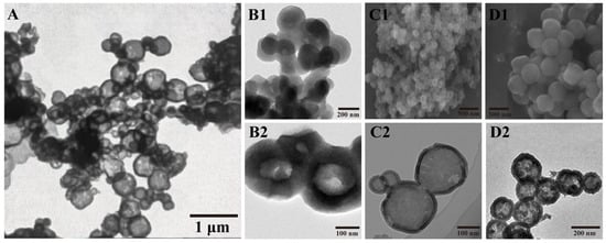 Figure 1(B1,B2) display TEM images of HMSNs synthesized with anhydrous sodium carbonate as the etching agent, followed by selective etching for 7 h and template removal via a 3-h reaction with hydrochloric acid in hot ethanol. These HMSNs exhibited thick shells, small internal cavities, and significant particle aggregation. The structural features suggest that the extended etching time led to excessive material dissolution, resulting in poorly defined shapes and severe adhesion between particles [37,38]. The lack of well-formed hollow structures and the presence of structural irregularities highlight the limitations of prolonged etching under these conditions [39].