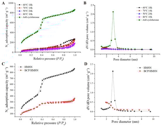 Nitrogen adsorption-desorption isotherms and pore size distribution curves of hollow mesoporous silica nanoparticles (HMSNs) and β-cypermethrin-loaded hollow mesoporous silica nanoparticles (BCP/HMSNs) synthesized under various conditions. Nitrogen adsorption-desorption isotherms (A) and pore size distribution curves (B) of HMSNs synthesized under different etching times, temperatures, and with the addition of cyclohexane. Nitrogen adsorption-desorption isotherms (C) and pore size distribution curves (D) of HMSNs and BCP/HMSNs.