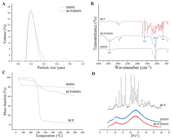 The particle-size distributions of HMSNs and BCP/HMSNs are shown in Figure 3A. Both nanoparticles exhibit a size distribution predominantly concentrated in the range of 100–400 nm, with HMSNs and BCP/HMSNs showing average particle sizes of 183 nm and 189 nm, respectively. The slight increase in the particle size of BCP/HMSNs compared to HMSNs confirms that BCP molecules were successfully encapsulated within the pores of the HMSNs, rather than being merely adsorbed onto their external surfaces. This result aligns with the mesoporous properties observed earlier (Section 3.2), where reductions in specific surface area and pore volume were also consistent with internal loading of BCP molecules.