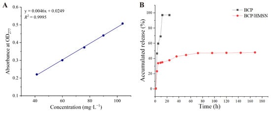 The in vitro release behavior of free BCP and BCP/HMSNs in a DMF–water solution was analyzed to assess the controlled-release capabilities of the mesoporous silica nanoparticles, and the results are shown in Figure 4. The calibration curve for BCP in the release medium (Figure 4A) exhibited excellent linearity (R2 = 0.9995), confirming the reliability and accuracy of the quantitative measurements used to monitor the release profiles. Figure 4B shows the cumulative release profiles of pure BCP and BCP/HMSNs in the release medium. Due to the poor water solubility of BCP, a solvent-based medium was chosen to ensure effective dissolution and release measurement [56]. DMF–water solution was selected over lower-boiling-point solvents such as methanol due to its compatibility and stability during prolonged release experiments [57].