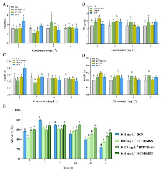 Safety evaluation of hollow mesoporous silica nanoparticles (HMSNs) and β-cypermethrin-loaded hollow mesoporous silica nanoparticles (BCP/HMSNs) on the roots and shoots of maize seedlings, and insecticidal performance. Fresh weight of roots (A) and shoots (B) of maize seedlings after treatment. Dry weight of roots (C) and shoots (D) of maize seedlings after treatment. Mortality of maize borer larvae with different concentrations of 4.5% BCP/HMSNs and 4.5% β-cypermethrin (BCP) emulsion at different times (E). Statistical significance (p < 0.05) among the data (mean ± SD, n = 3) from different treatments was determined by one-way ANOVA with Tukey’s multiple comparisons test. Significant differences are denoted by different letters (e.g., a, b, c, d) above the bars.